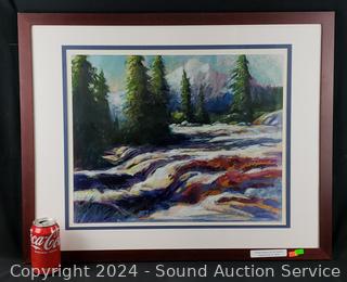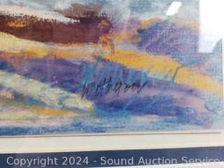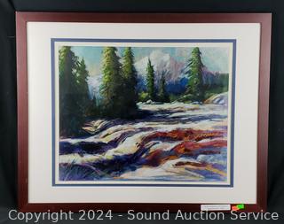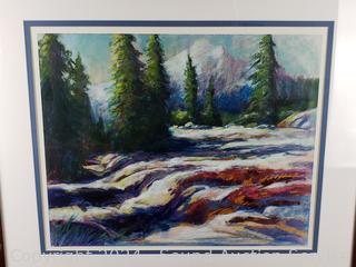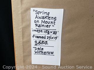 Titled "Spring Awakens on Mt. Rainier", 29.5" x 23.5", framed, matted with glass. Some art information on the back. Dale Witherow is a local artist with several awards and grants. His art has been exhibited on the east coast mid-Atlantic region Texas, New Mexico, Mexico, and more recently in up to 14 West Coast Galleries. His Works display his love for color, design & hidden symbolism. "Painting for me is an exploration of the work, self, color design memory, emotion and the light and dark of all things" - Dale Witherow.