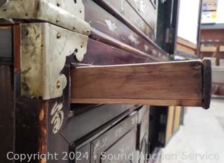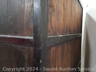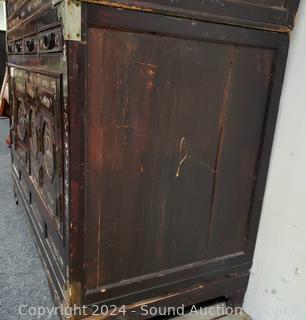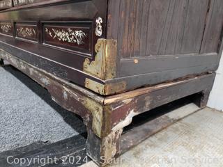 Solid wood construction, front panel adorned in mother of pearl inlay, 4 drawers with lower cabinet. right facing side has some damage. Signs of wear from age, use. 76.5" H x 40.5" W x 20.25" D.