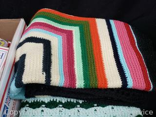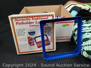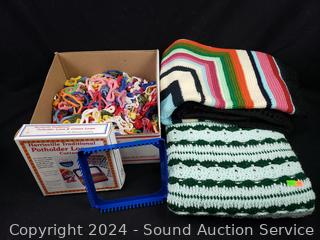 Lot #0134: Potholder Loom & 2 Small Knitted Afghan Throws