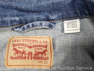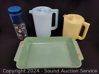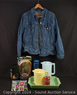 Women's Levi jacket S:2X, Fire King jadeite 9" x 13" baking dish, Tupperware pitchers, Virtuo travel mug, Legolas Lord of the Rings action figure (package has been opened, appears complete). Refer to photos for more details.