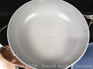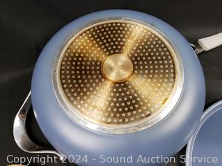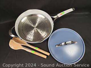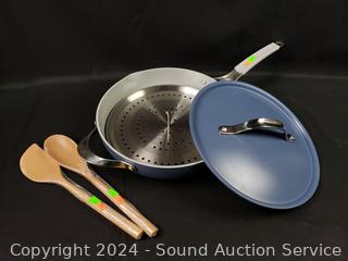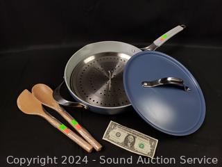 Lot #0266: Tramontina blue 12" Multipurpose Pan w/Steamer Insert, Lid & 2 Utensils