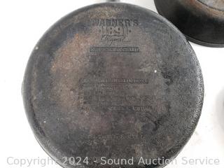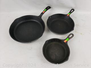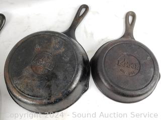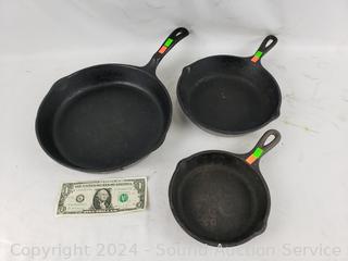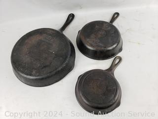Lodge 6.5" & 8", Wagner Ware 10.25". Could use a proper cleaning, seasoning. All appear to be sitting flat.