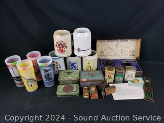 Lot #0149: Mugs, Worlds Fair Glasses, Vtg. Tins