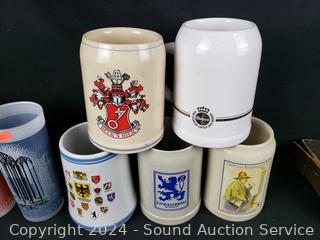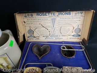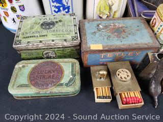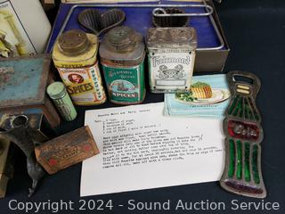 4 World's Fair Glasses, 5 German Mugs, Assorted vintage tins, match box holders, bottle opener, Rosette irons. 10.5" H x 18" x 14" tote. Refer to photos for more details.