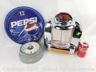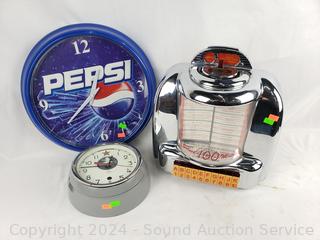 Lot #0084: Novelty Jukebox Radio, Pepsi Clock, Russian Mechanical Clock
