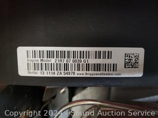 Had to jump to start, may need a new battery, started and ran. Black plastic over motor is missing pins to hold it down, only has a couple. Don't see a runtime. Automatic forward/reverse. Comes with grass shoot not attached. Signs of wear from use, overall good condition. Manufactured in 2014, Model 13CC26JD011.