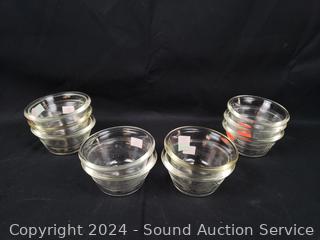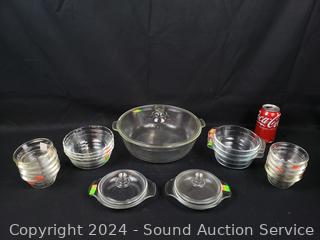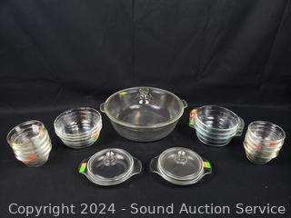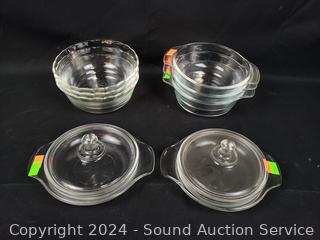 4.5" bowls (2 with lids), 10" covered server, 3.5" ramekins. Don't see any majro issues.