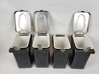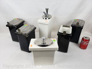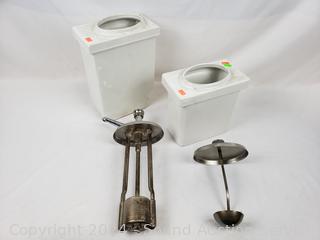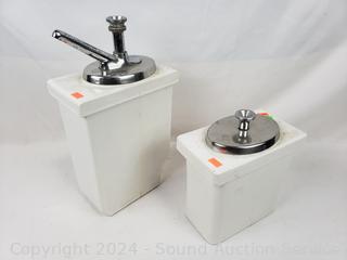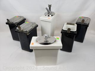 2 Hall, 4 Graumax, 1 with pump 4 with spoons, 1 is missing lid. Approx. 7.25" to 10" H x 4" x 6.5" to 7.5". Signs of wear from use, refer to photos for more details.