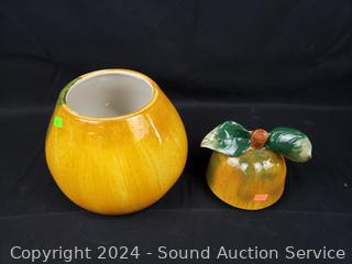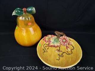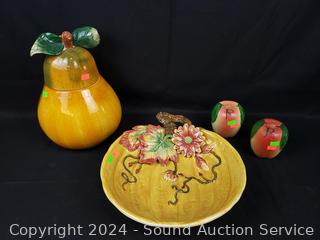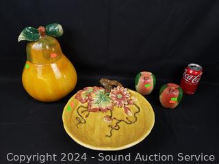 Lot #0091: Squash Cookie Jar, Pumpkin Center Bowl, 2 Apple Peppers