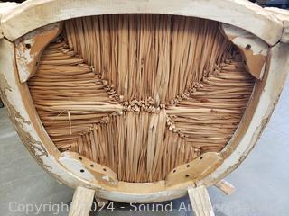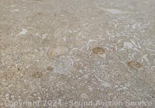 Log center pedestal base, large 71" Dia. 2" thick limestone top (do see some fossils, shells, etc), 31" H x 71" Dia. overall. chairs all come with plaid chair pads. Chairs are all carved, rush seats & cane back. Well made in excellent condition, don't see any issues.