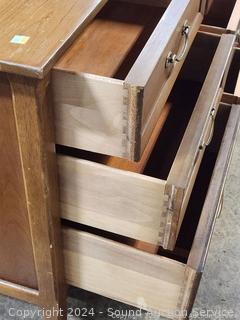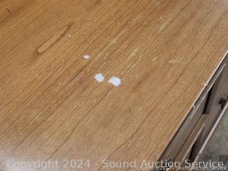 Some scuffs, scratches in finish. Appears to be solid wood construction, dovetail joinery. 30.75" H x 60" W x 20.25" D.