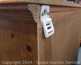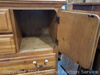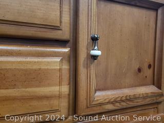 Cabinet door latch is messed up needs replaced, not working properly cannot shut door all the way. Wood fronts, particle board construction, wood veneer, laminate top. 45" H x 36" W x 18" D. Matches the previous lot. Some scuffs, scratches in finish.