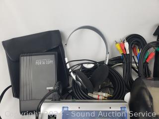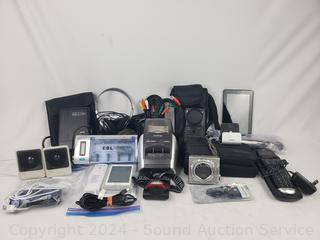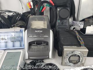 All untested. Projection alarm clock, Logitech Fotoman Plus, battery charger, Amazon Fire Kindle tablet, Brother Label printer, Silver Reed Porta Copy, Digital Wireless weather station, thermal detector, Logitech Harmony One remote, audio video cables, Sharp 722 MD Portable Recorder & more. Refer to photos for more details.
