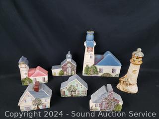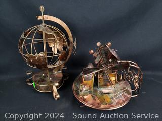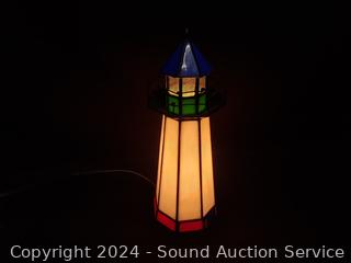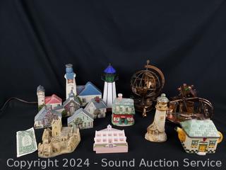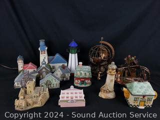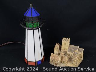 Stained glass lighthouse lamp, metal art globe, teapot, animated metal art windmill, village/house decor. Refer to photos for more details.