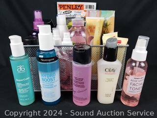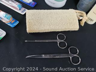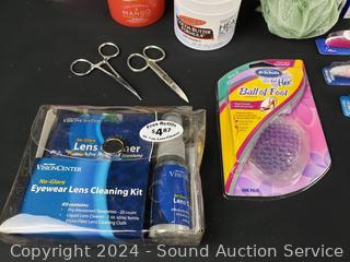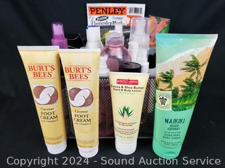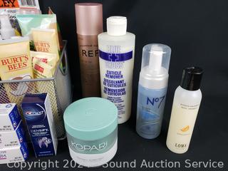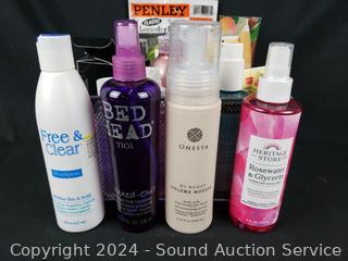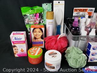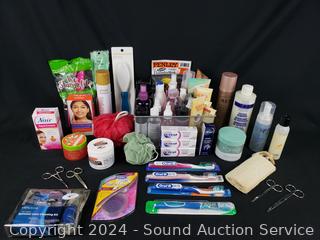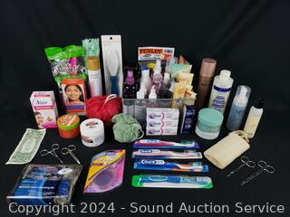 Foot files, toothbrushes, cuticle remover, dry shampoo, luffa's, foaming cleanser, rosewater, skin scalp care, hair spray, cocoa butter & more. All appear full or mostly full, many items are sealed. Refer to photos for more details.