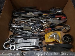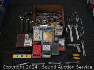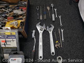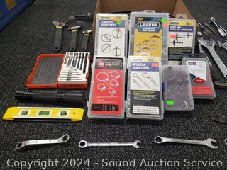 Sealed 50pc lynch pin assortment, sanding drum kit, sealed 150pc hitch clip assortment, 40pc hose clamp assortment, 36pc sealed hose clamp assortment, multi grommet tool kit, 12pc Ridgid screw extractor set, 18pc sealed spring-wing toggle bolt assortment, ratcheting wrenches, adjustable wrenches, screwdrivers, rasp & more. Refer to photos for more details.
