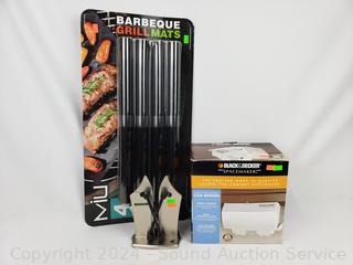 Bavarian Edge knife sharpener, 4pk Miu 16" x 20" grill mats, undercabinet sharpener appears to be functioning as intended.