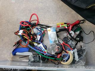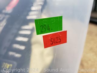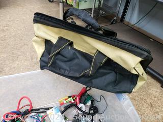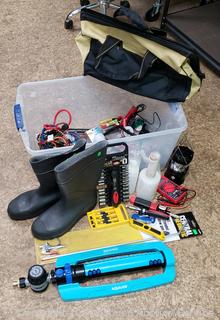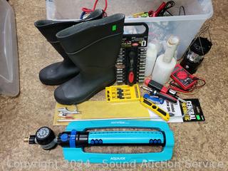 2ft extended blower, Servus Rubber Boots S:10, Pittsburgh 21pc Socket Set, bungee's, various hand tools, wire stripper, multimeter, electrical tape & more. Refer to photos more details. 11.5" x 25" x 15.5" tote with lid.