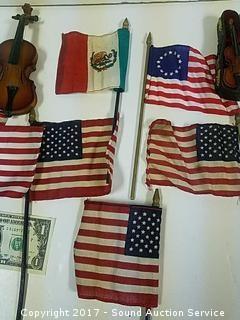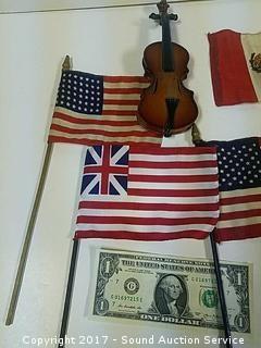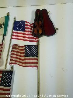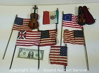 Lot #0289: Cigar Box w/Miniature Violins & various Flags