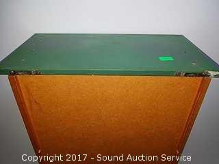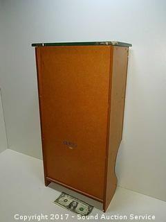 Has country graphics on the front. 3 shelves total. Approx. 23" tall, 11" wide and 6" deep.