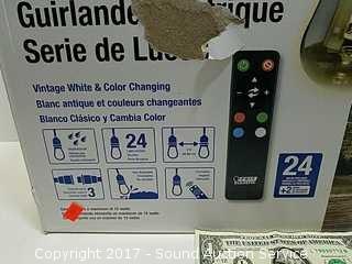 Has 3 settings: vintage, white and color changing. Light string is 48ft. Has 24 light sockets, bulbs included. Commercial grade. Retails for $69.99.