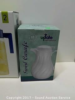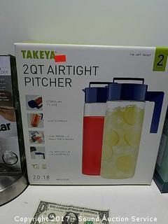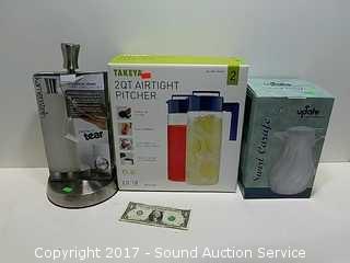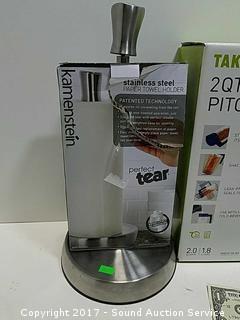 Includes: NIB stainless paper towel holder, has some marks to the base, NIB 2 QT airtight pitchers by Takeya and NIB swirl carafe, 42oz.