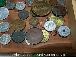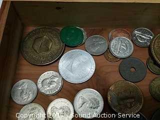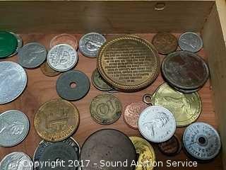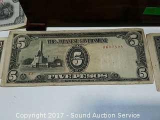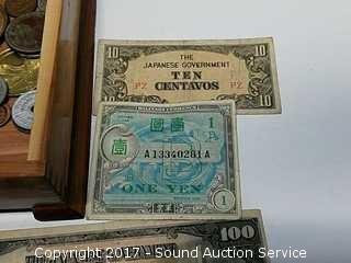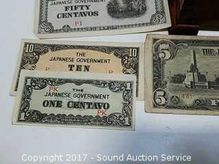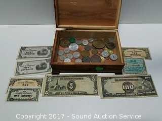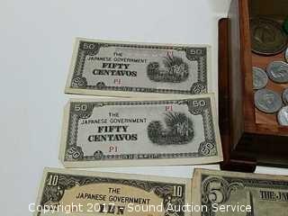 Comes in wooden box. Includes: Japanese military paper currency, tokens, medallions, and more.