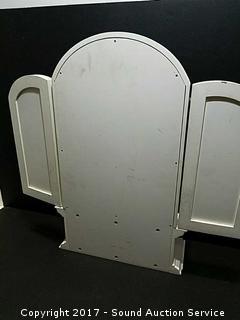 Has tri-fold mirror, one shelf and one drawer. Approx. 21" tall, 22" wide and 5" deep.