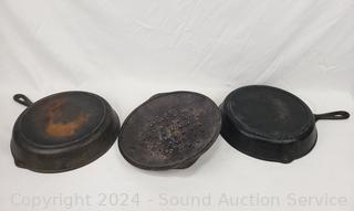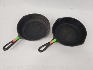 (2) 8" & (2) 11". One smaller pan bottom is warped not sitting flat, the others are sitting flat. All could use a proper cleaning, seasoning. Made in USA, Taiwan.