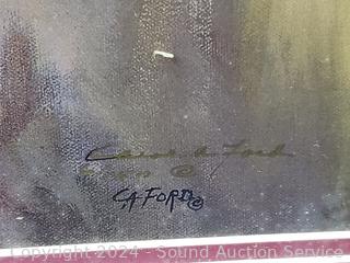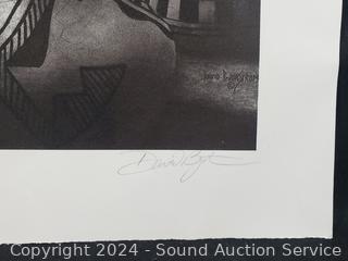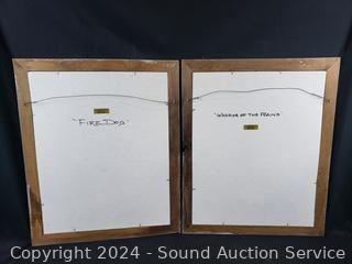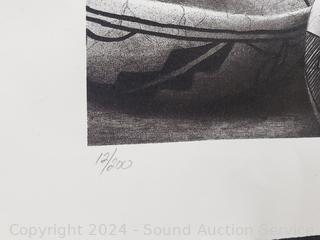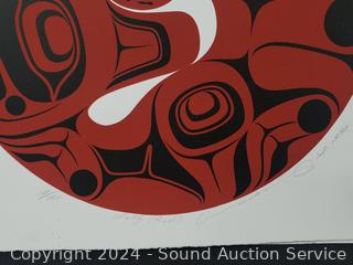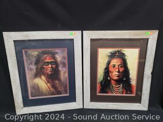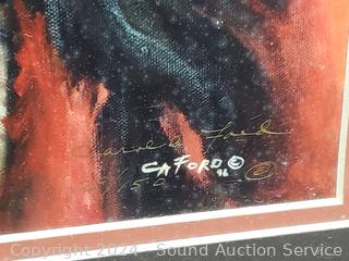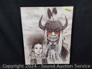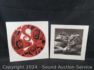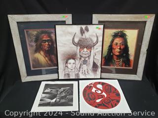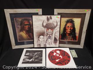 Signed David Byt? Pots Print #12/200, 13" x 13". Signed "Wolf (Red)", #122/350, 13" x 13". Signed Amtanks? Chief & Son drawing, 20" x 16". Signed CA Ford #29/150 & #6/150 Native Warrior Prints, framed, matted with glass, 23" x 19".