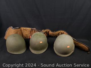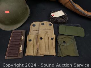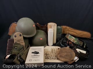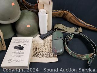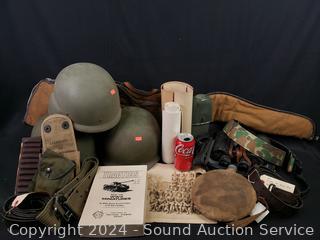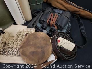 2 Helmets, WWI leather belts, 1919 Infantry Photo, Canteen, rifle case, Ofuna 7x50 binoculars, Tractics WWII Miniatures Manuals & more. Refer to photos for more details.