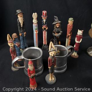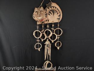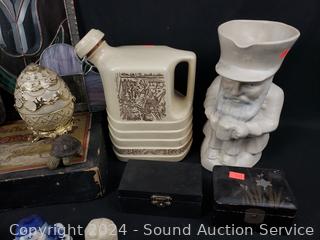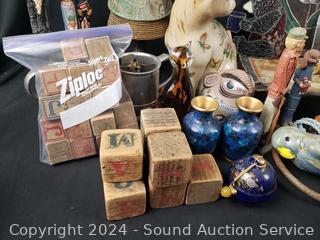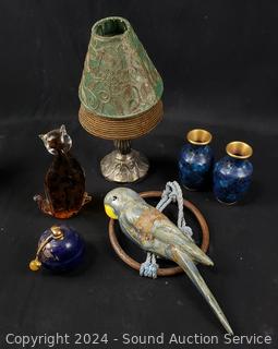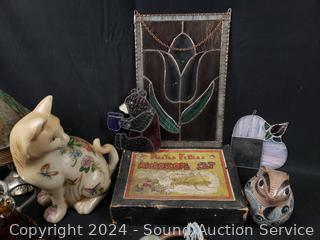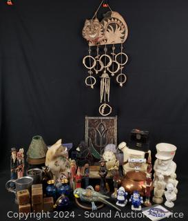 Old microscope set, stained glass window decor, pottery windchime, wood blocks, copper kettle, pitcher, and other decor. Refer to photos for more details.
