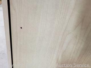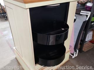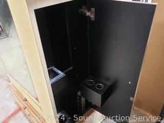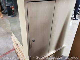 Both mirrors spin to reveal 2 shelves, 4-drawers with ball bearing drawer guides, 2 trays, 2 Cabinets (one missing a pull), built in power strip. 48.5" H x 32" x 34". Simulated wood grain, laminate finish. Don't see any major issues.