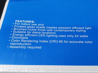 Brushed nickel finish, frosted glass lens, 24W, 1560LM, 4000K color. Appears to be functioning as intended, don't see any issues.