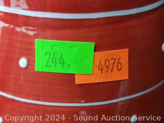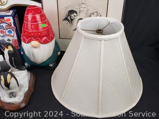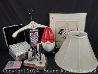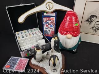 Painted wood hanger, ceramic gnome cookie jar, ceramic penguin sculpture, Bicycle playing cards, Small case (full of dominoes?), lamp shade. Refer to photos for more details.