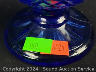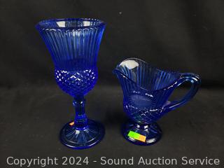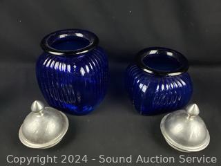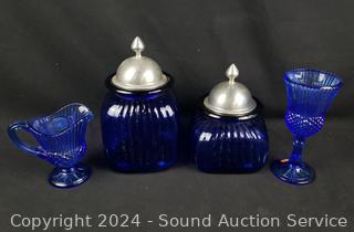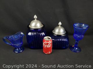 Lot #0158: 2 Cobalt Canisters & Coin Embossed Goblet & Pitcher