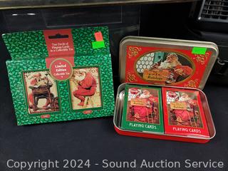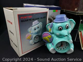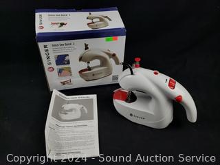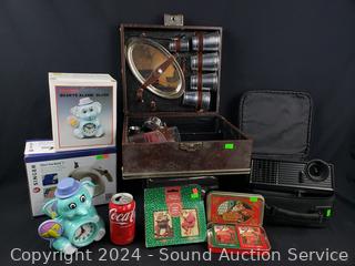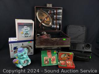 Santa playing cards, quartz alarm clock, Optoma projector w/case (no power supply), Singer Stitch Sew Quick 2 sewing machine (no power supply), travel bar. Refer to photo for more details.