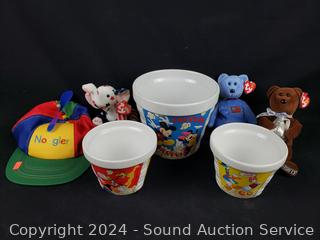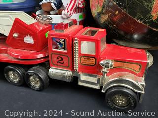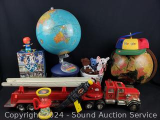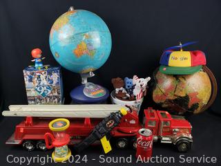Spinner cap, (2) 12" globes (one has some damage, age), ceramic popcorn container, hourglass toy, beanie babies, Edgar Martinez collectible statue, Tonka Hook & Ladder steel toy vehicle. Refer to photos for more details.