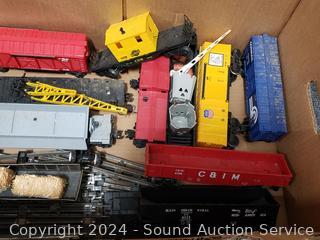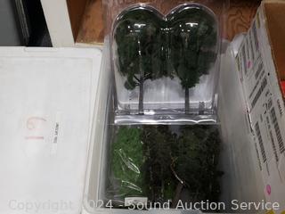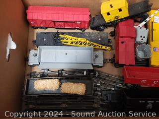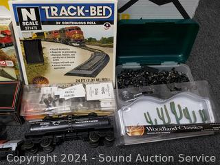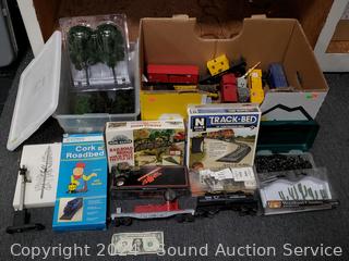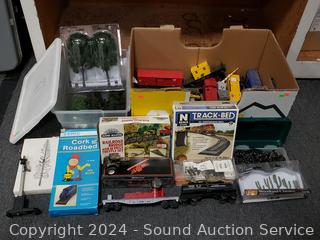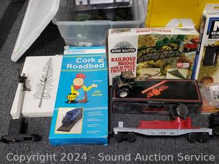O-Gauge train tracks, cars, landscape trees, railroad bridge, Ho scale cork bed, track bed, parts etc. Refer to photos for more details.