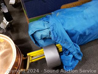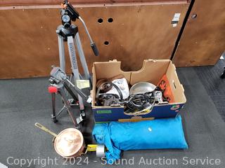 SVKenlock65 camera tripod, Solidex camera tripod, tent, (unknown completeness), copper pans, sneakers, leather belts & more. Refer to photos for more details.