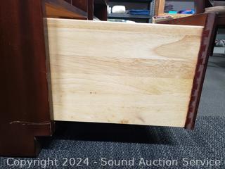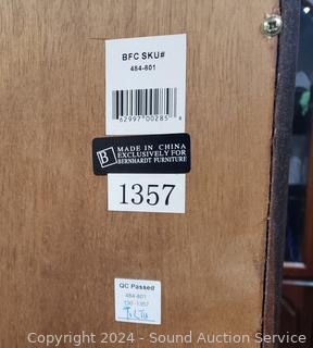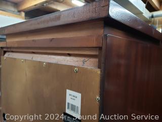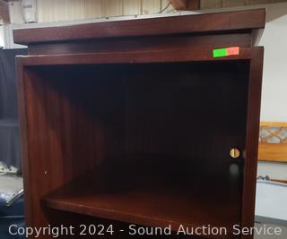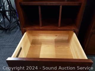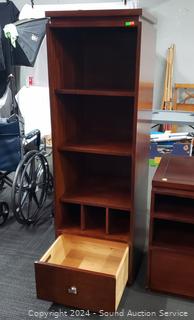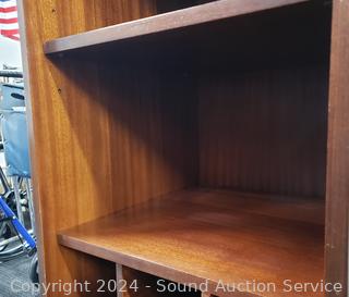 Matches the previous lot. Cord holes on the shelves. 60.5" H x 19" W x 20" D. A few minor scuffs, overall great condition.