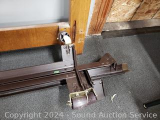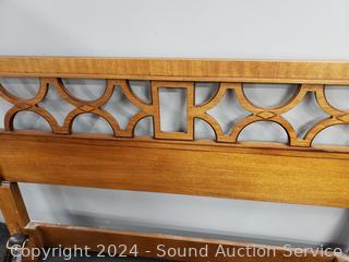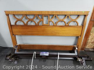Steel frame, wood headboard. 38.5" H x 60.5" W. Some scuffs, wear to finish.