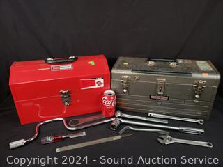 Grey box is full of tools, red box is empty, in great cosmetic condition.