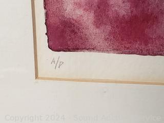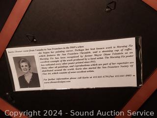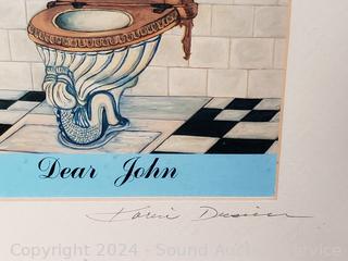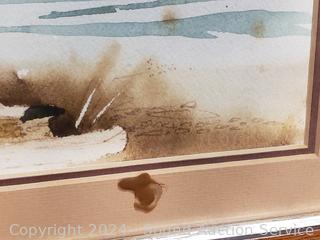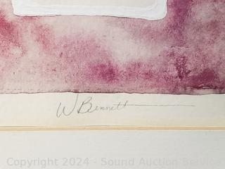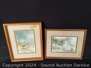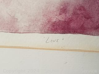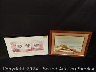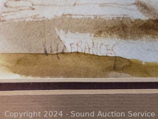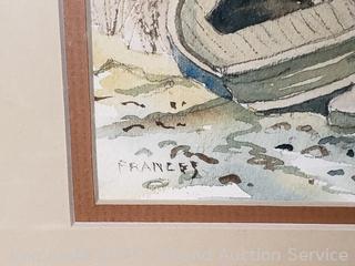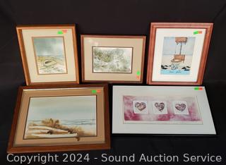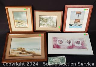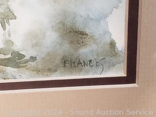 Karen Diesner signed "Dear John" watercolor?, 11.5" x 9.5". 3 are Frances signed watercolors, Beach, boat, umbrella 15" x 11", 9" x 10.75". W.Bennett A/P "Love", 16.5" x 9.25".