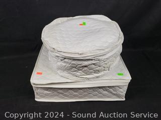 8 cups, 8 saucers, 8 snack plates 8 lunch plates, 8 dinner plates. Don't see any issues. Comes with storage bags.