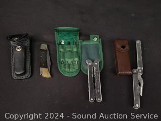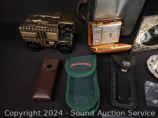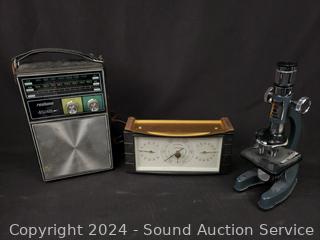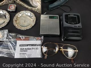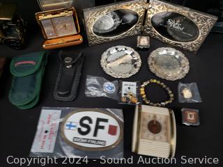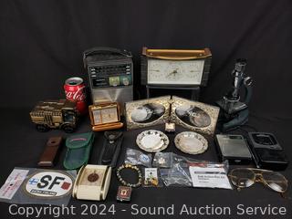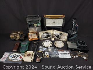 Cast metal coin bank, microscope, Airguide weather station, Realtone Radio, pocket knife, multitool, Phinney Walker travel alarm clock, radios (untested), pins. Refer to photos for more details.