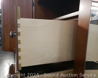 3 drawers, doors can complete open to store a TV if you remove the shelves, does have a cord hole for media. Appears to be solid wood construction, dovetail joinery. Well made. 80" H x 44" W x 20.5" D. IN excellent condition, don't see any issues.
