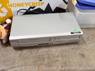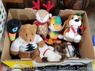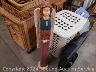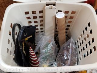 Wood angel figure, clothes hamper, 23" LED Flat screen TV w/Remote (powered on once and then would not power on again), Sylvania VHS/DVD player, stuffed animals, various decor, a couple small totes with lids. ATTN: Items may be missing pieces, damaged, not functioning, complete, no issues, etc. All items as is. Refer to photos for lot contents.