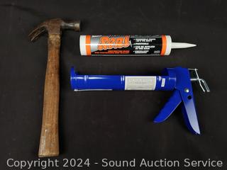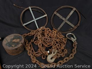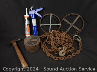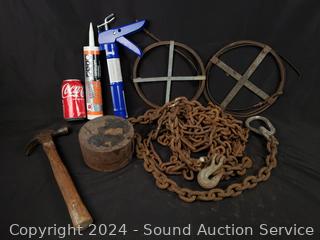 Various wear from age, use. Approx. (2) 10ft & (1) 6ft lengths of chain, 2 feed lines, hammer, caulk gun w/tube of caulk.