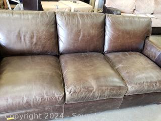 Signs of wear from use, some minor scuffs, scratches, overall good condition. Leather could use a proper conditioning. Approx. 32" H x 87" L x 40" D x 18" to seat.